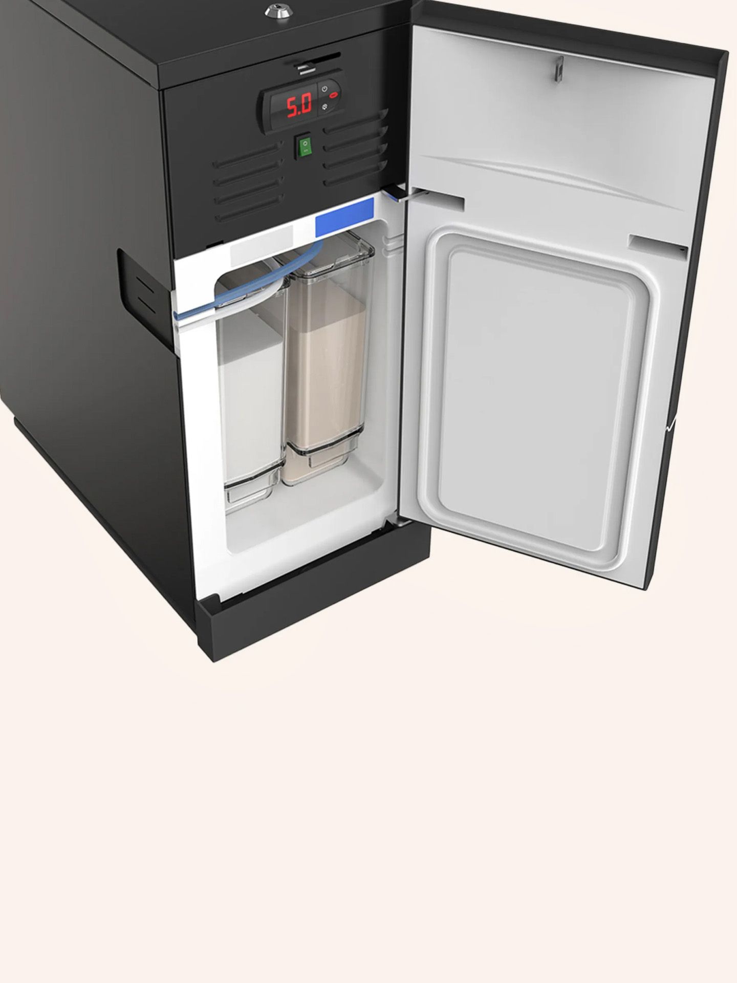 The Flavour Point syrup station expands the drinks menu with up to four syrup varieties and enables unlimited creative recipes. The recipes are stored directly in the coffee machine's system and prepared automatically at the touch of a button. The compact unit is located under the counter and saves space. With a syrup capacity of four bottles plus two in reserve, it offers flexible application options for a wide variety of coffee creations.